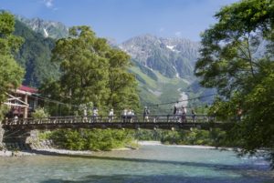 透き通った梓川をのぞむ「河童橋」は、上高地のシンボルにして、絶好のビューポイントです。